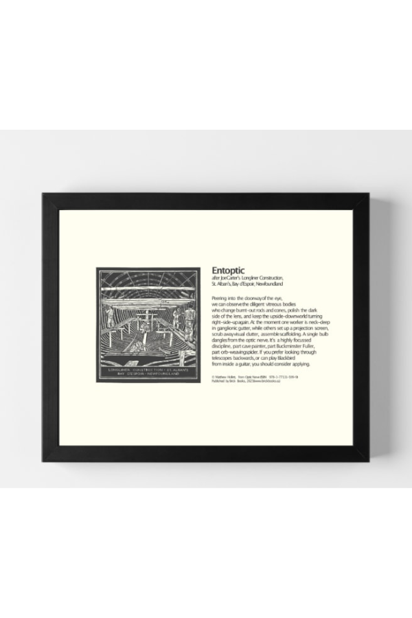 One of 50 letterpress broadsides of the poem “Entoptic” from Matthew Hollett’s dazzling and playful collection of poems, Optic Nerve. Printed at Everlovin’ Press in Kingston, it features the linocut by Joe Carter on which the poem “Entoptic” is based.