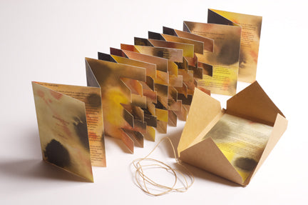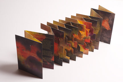 A two-sided flag book, inkjet printed both sides on Red River Premium Matte double-sided paper using an Epson 4880 inkjet. The pages are laser cut and scored, and trimmed, folded and assembled by hand. The wrapper is Cave Paper, tied with linen twine. Edition 75.