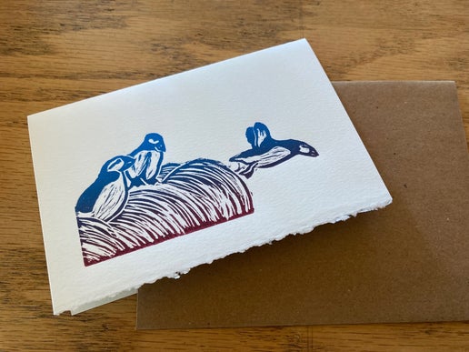 One of the joys of summer is the return of the puffins to their breeding grounds near our shore. This card is a special favourite for visitors to the shop. Each card is an original print, and the colours vary.