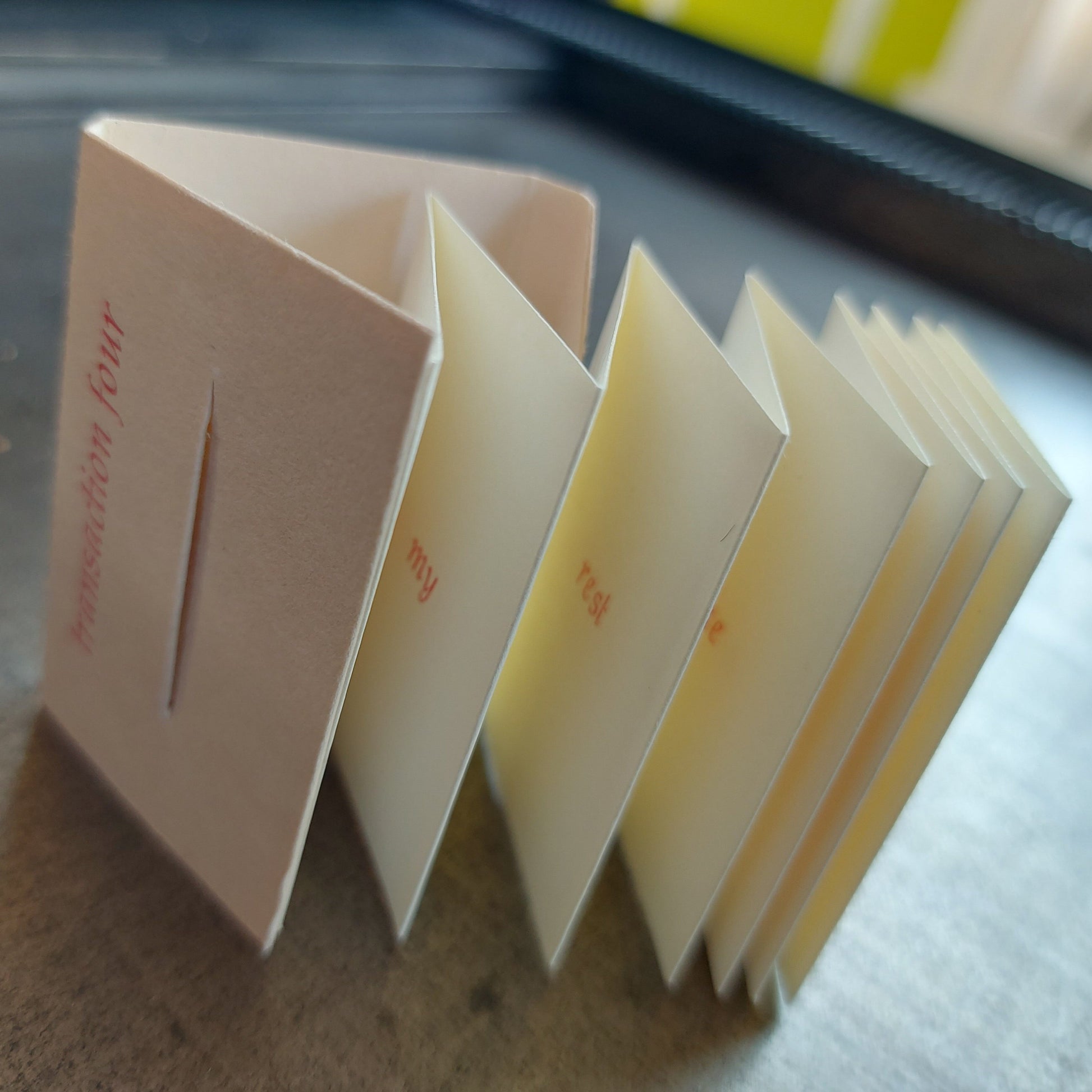 Fourth in a series of small poems about the relationship between a book and its reader. Each page contains one word; the meaning changes depending upon how the reader groups the words.