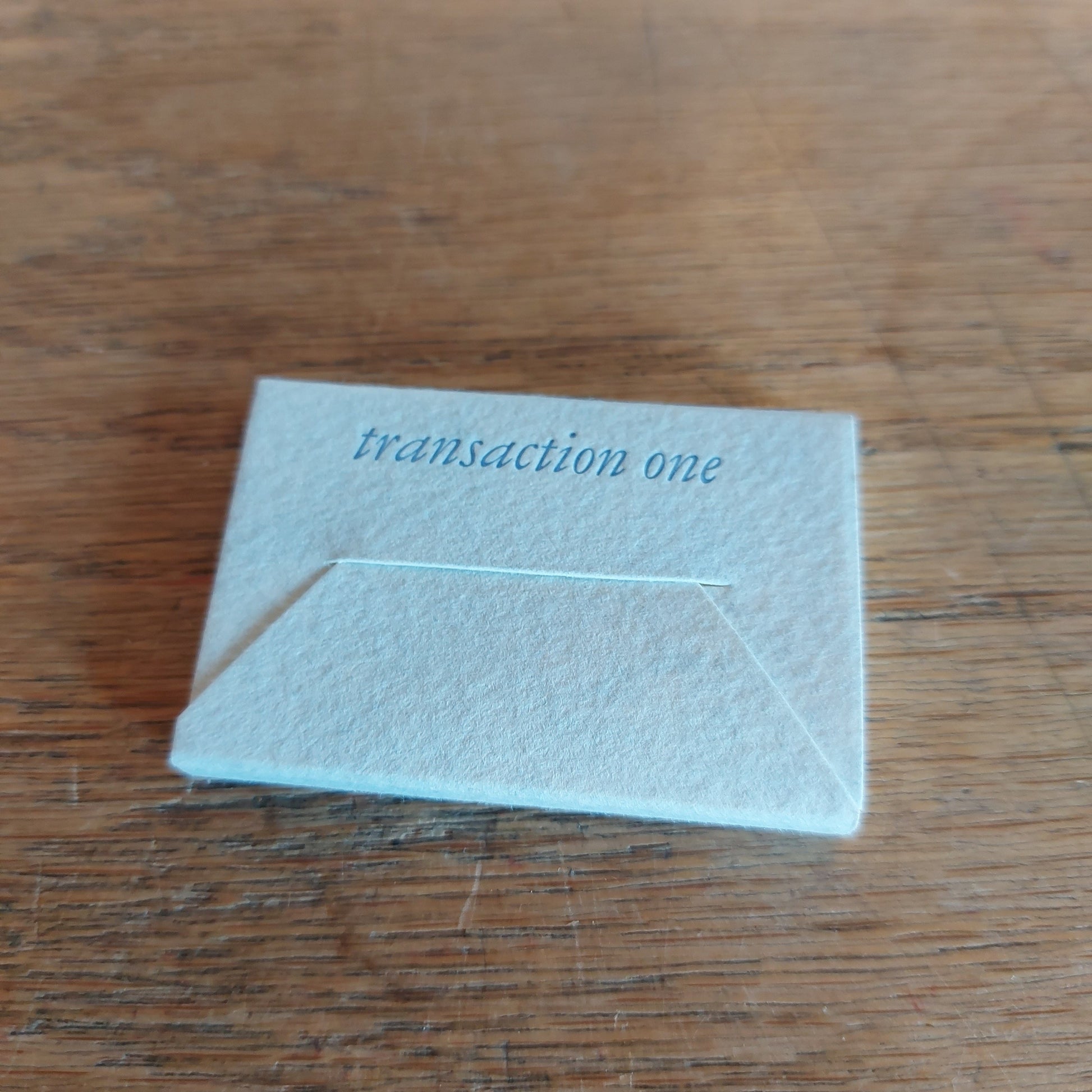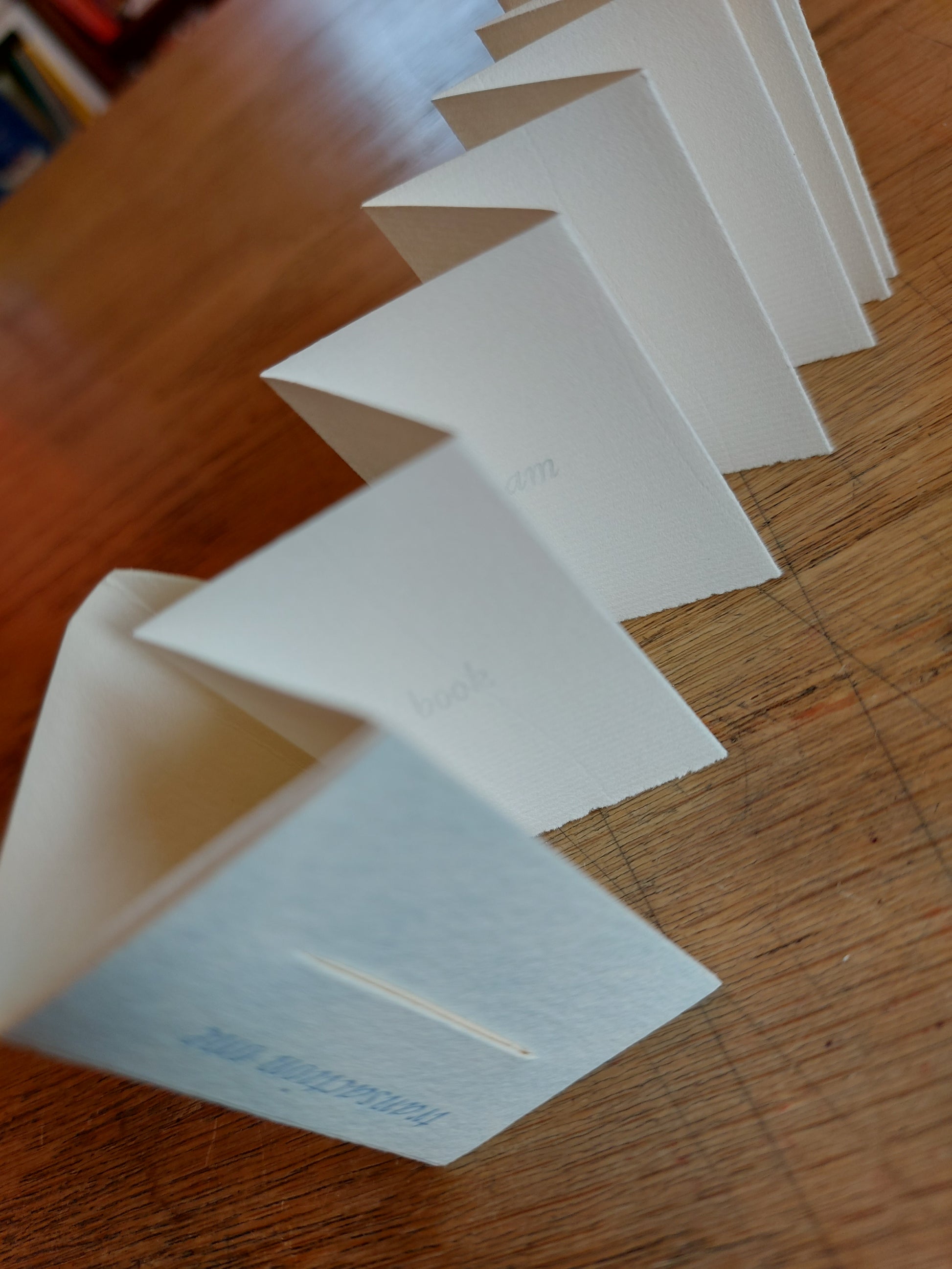 Concertina-folded, printed on both sides, in wrapper of printed, acrylic-stained Opus Watermedia paper. Each page contains one word; the meaning of the text changes depending upon how the reader groups and punctuates the words.