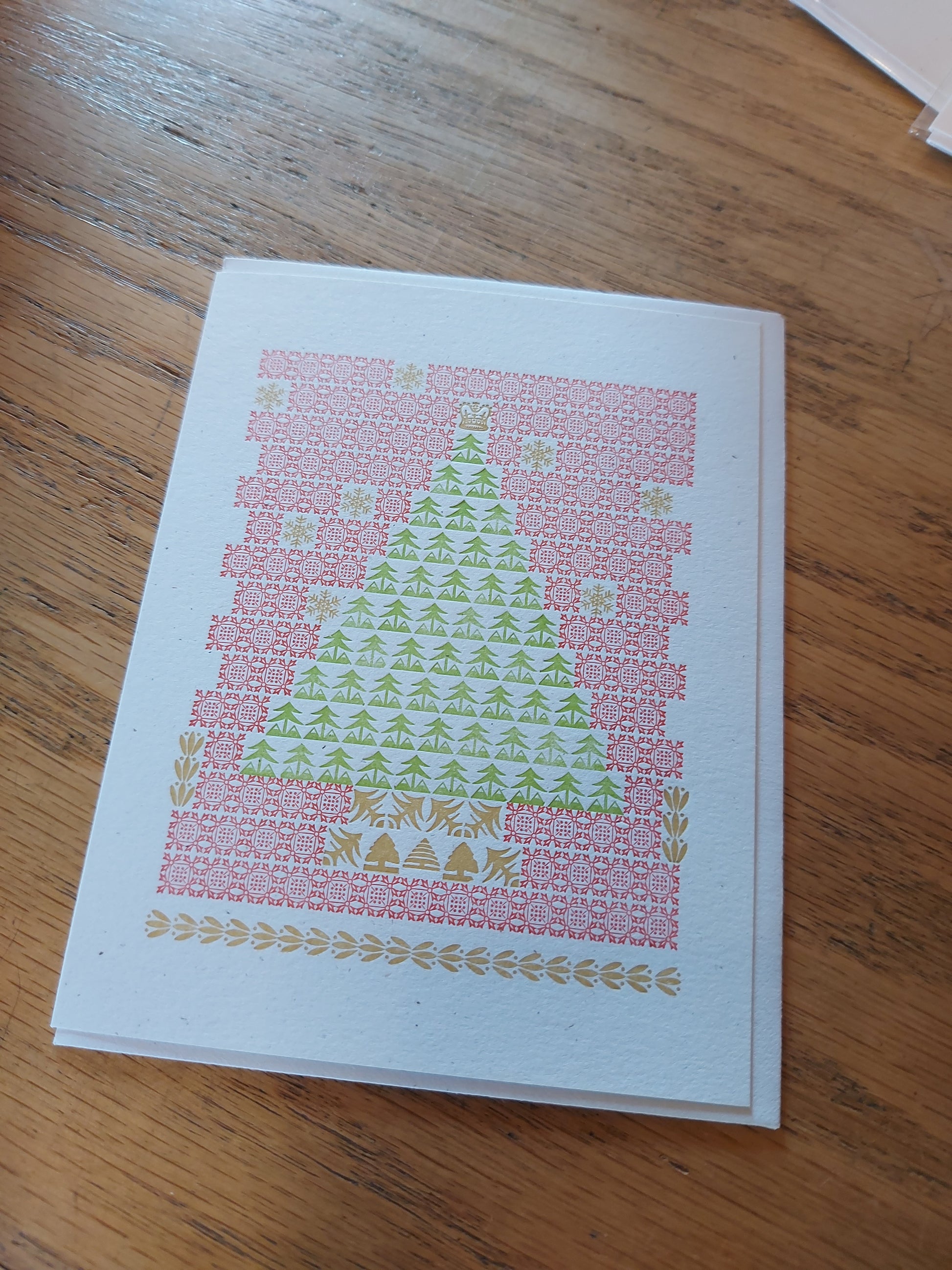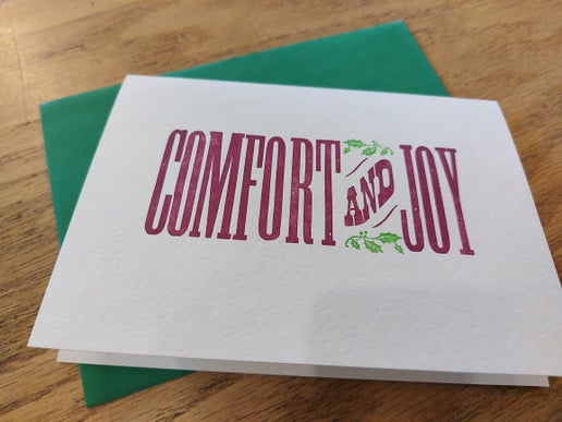 This bright and cheerful card is a wonderful way to celebrate the holidays. The front of this card has been printed several colours (one pass through the press for each colour) using with a collection of vintage lead dingbats (small printing ornaments). The inside is left blank for your message.